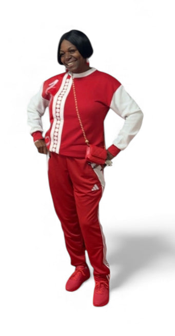 Red fleece sweatshirt with white sleeves. Faux leather pearls and 1913 Embroidered.